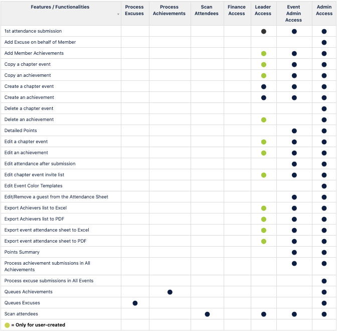 Note: Should you check off "EBoard" the system will automatically give the user "Scan Attendees" and "Questions/Answers." However, checking "EBoard" does not mean that they will show up as an EBoard Member on your Chapter Info page, it is simply giving this person the access as described in the chart at the top of this page.