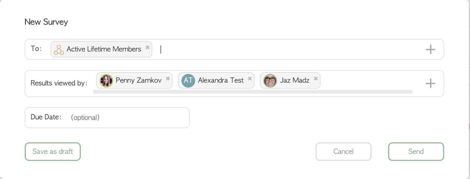 When you are creating a survey you can only send the survey to groups of Members (i.e. Active Lifetime Members or Intramural Dodgeball Team)