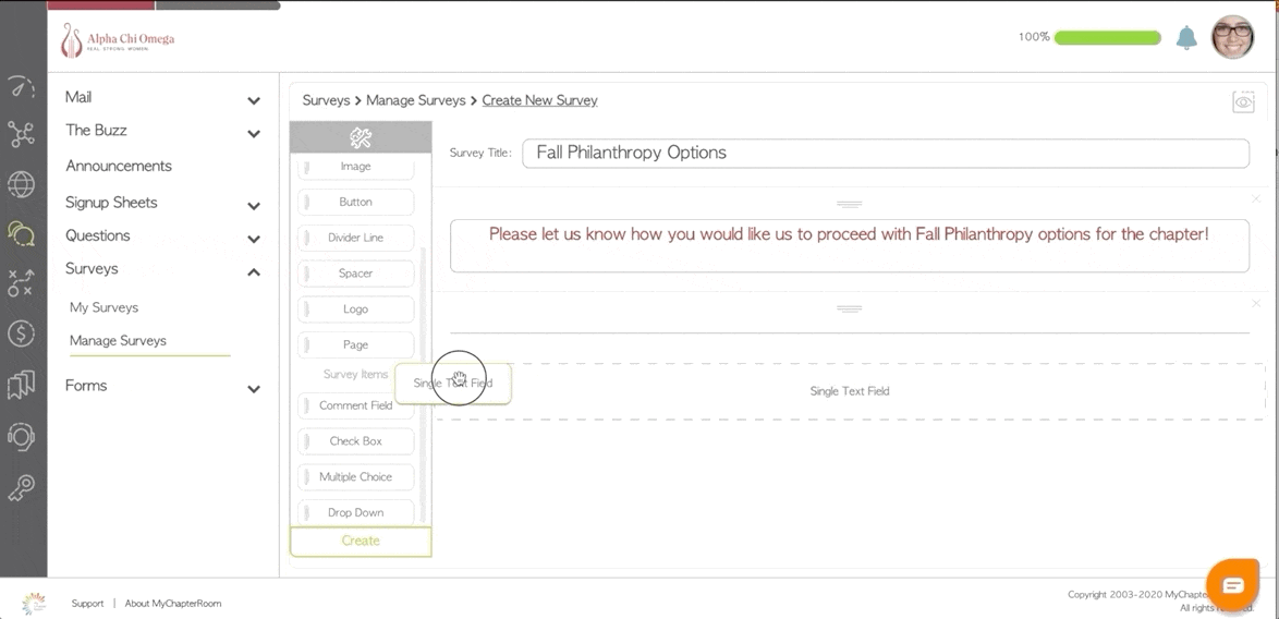 You will build your Survey much like you build a form, by dragging and dropping the components you want included into the main page of your survey.