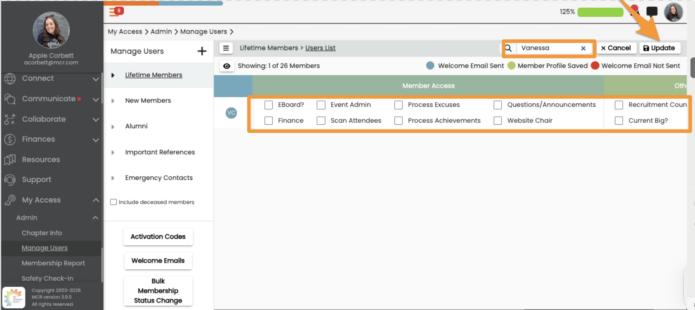 - Select the Access options you want the Member to have by clicking the box to the left of each option.